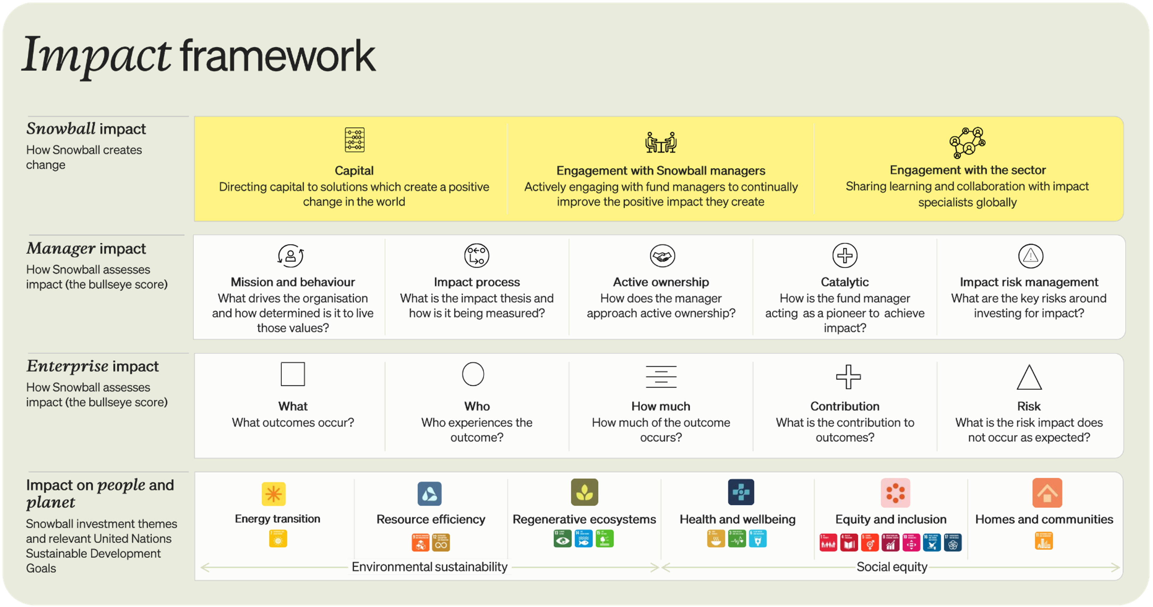 Enterprise impact: the potential and actual impact on people and planet of the investments that managers hold on behalf of Snowball.